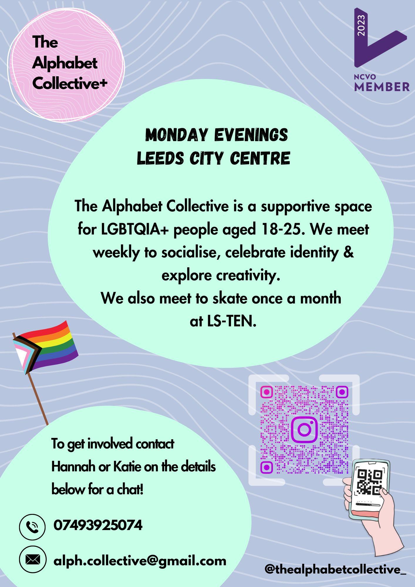 The Alphabet Collective (AC) is a Queer led community group which aims to provide a welcoming and affirming environment for intersectional LGBTQIA+ communities. The space is open to any individuals in Leeds and the surrounding area aged 18-25 who identify as LGBTQIA+, including those who may be questioning their sexuality and/or gender identity. We aim to celebrate all forms of Queer joy at The AC.